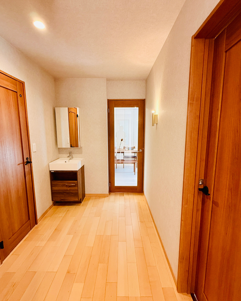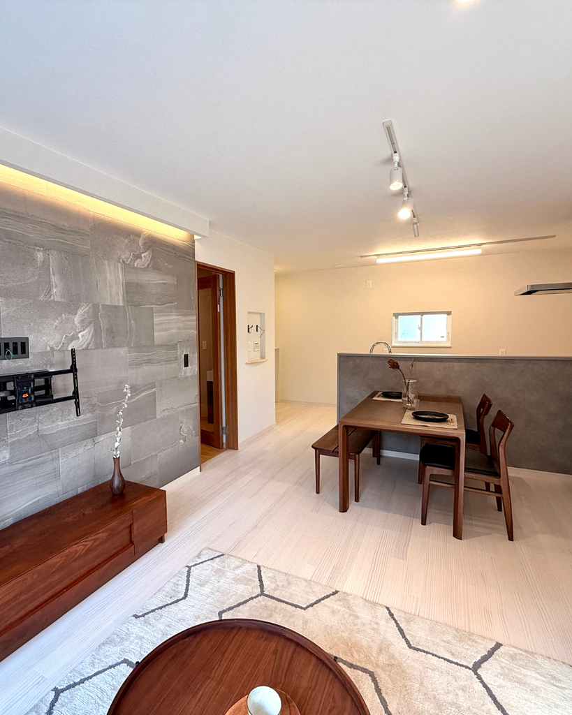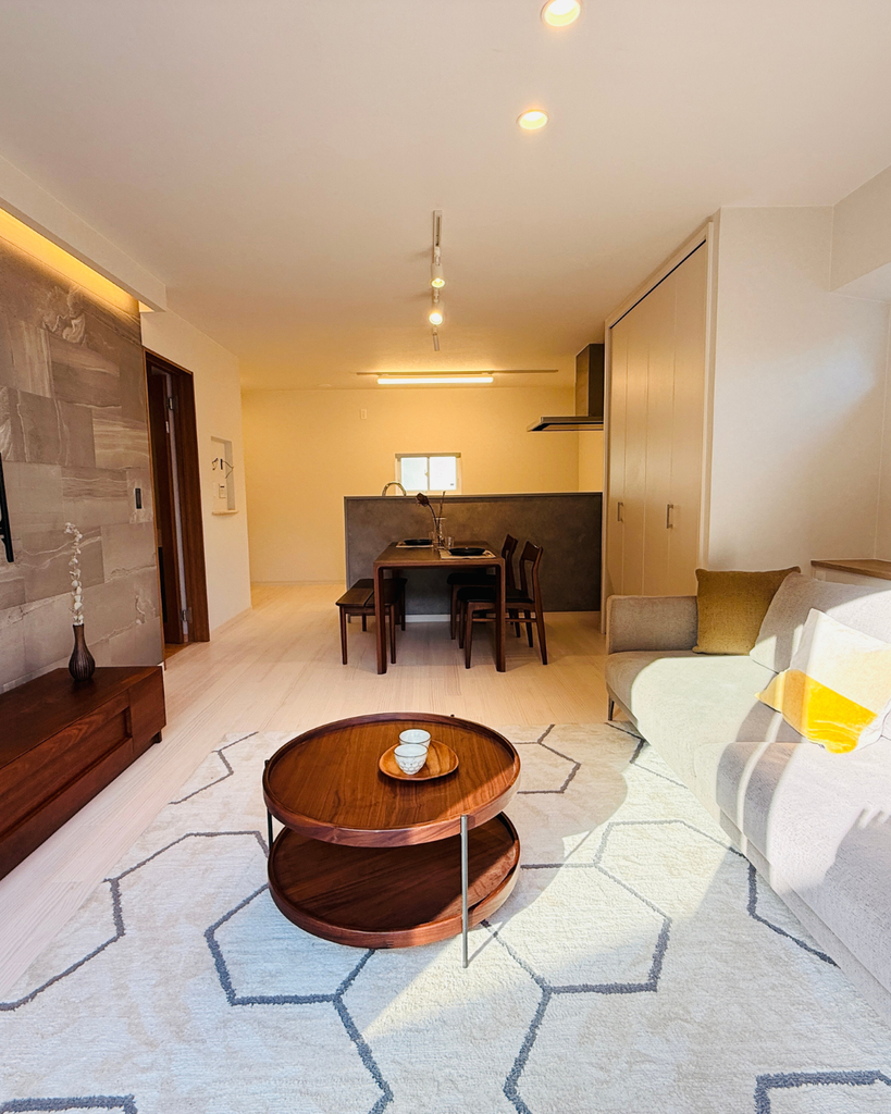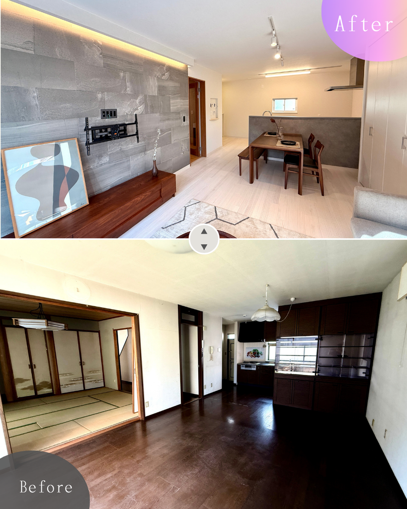 改修前は暗く閉鎖的だったLDKを、南向きの大きな窓から自然光がたっぷりと入る明るく開放的な空間へと再設計。ナチュラルな色合いのフローリングと温かみのある間接照明が、家族の笑顔があふれる居心地の良いリビングを実現しました。