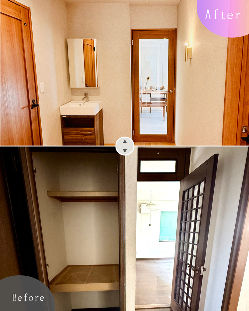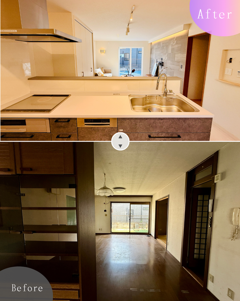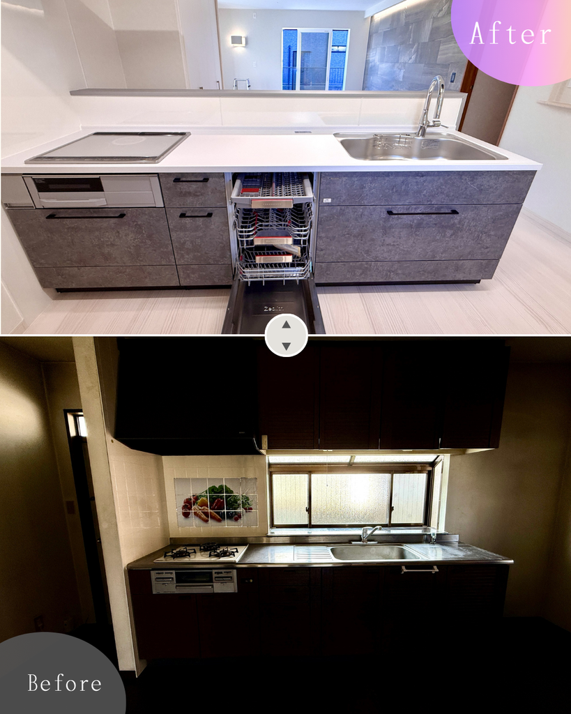 古く使いづらかったキッチンを、収納力抜群の最新設備へ一新。清潔感のある白を基調とした明るいデザインに、機能的な設備と収納、家電スペースを確保。毎日の家事を快適にサポートします。